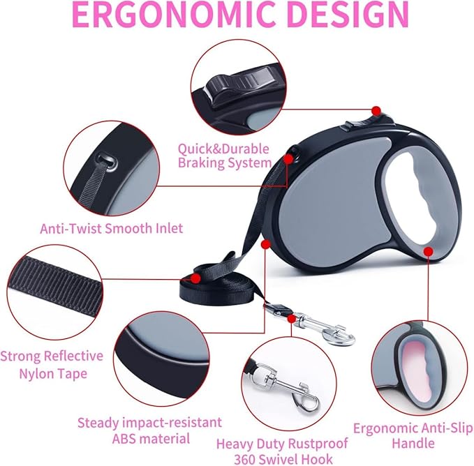 3M Retractable Pet Leash with 360ยฐ tangle-free tape, one-hand lock system & anti-slip grip โ safe, strong & perfect for daily walks.